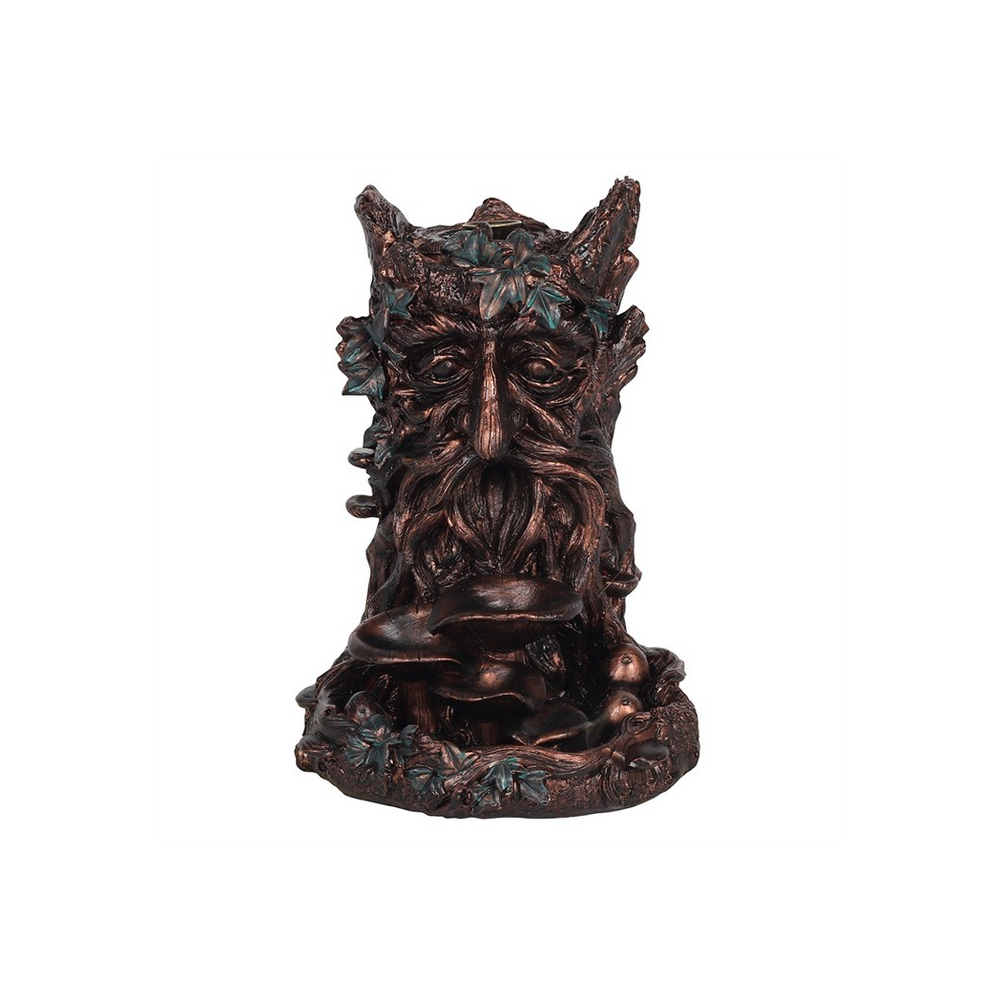 This resin backflow incense burner features a bronze effect Tree Man with green foliage and toadstool accents. To use, place a backflow cone on top of the Tree Man's head and watch as smoke flows out of his open mouth and cascades over the forest mushrooms below. Product Dimensions: H18cm x W13cm x D13cm Packaged Dimensions: H21cm x W17cm x D16cm
