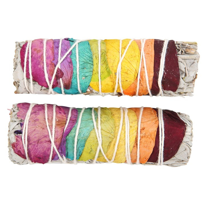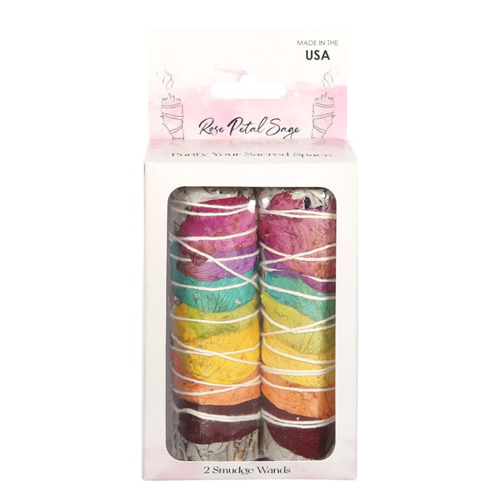 This set includes 2 bundles of dried white sage, known as smudge sticks or wands, accented by a rainbow of dried rose petals. Traditionally used for spiritual cleansing rituals, smudge sticks are essential tools in reiki, witchcraft and other sacred practices. Made in the USA.